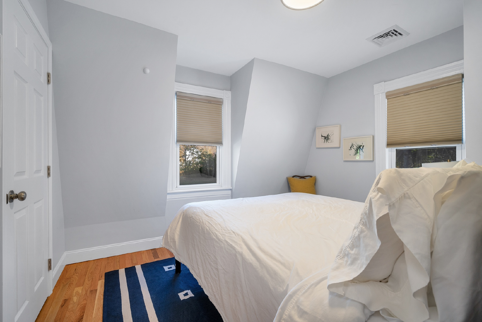 - Bedroom 1: A Queen size mattress with dual nightstands, a cozy rug, a chest of drawers, and a shared bathroom in the hallway.